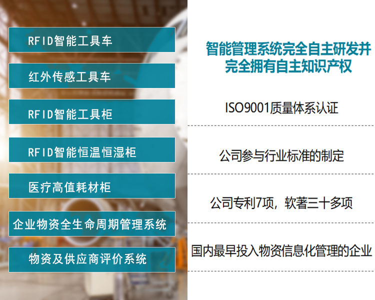 应用产品有:RFID系列工器具柜、RFID工具车、RFID系列档案柜、RFID拉杆箱、RFID医疗耗材柜、红外传感工具车、无人值守库房,主要解决方案:智能工器具管理系统、智能档案管理系统、物资全生命周期管理系统。